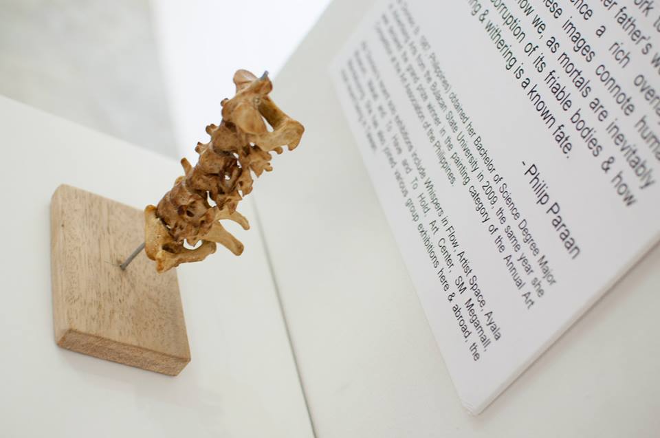 She re-imagines and re-animates these dressmaking tools’ from their basic utility and warps them into new life with set in various com-positional motifs, stitching them altogether in altered presences and sensibilities. While recognizing her father’s working days in ways they are fixed in her memory, she employs such proletarian symbols that extend homage to labor and hard work in a well-remembered landscape of production and familial situations. Conspicuously, her use of cloth and draperies can be more than an idiom of concealment and revelation, it’s a material that indeed surrounded most of her life and this strong influence can be attributed to how she was raised. In one particular piece, Dionisio appropriates needlework to underscore her context and theme, repeating his father’s work which gives this creative experience a richer overlay of meanings. Her images of exposed spinal column is a direct references to his father illness which she now drapes in cloth as if replacing sinews and muscles that once cling on it while she also uses them as metaphor for care and healing. Somehow these images connote human frailty and infallibility and they engage us how as mortals are inevitably subjected to the corruption of its friable bodies and how physical suffering and withering is a known fate.
